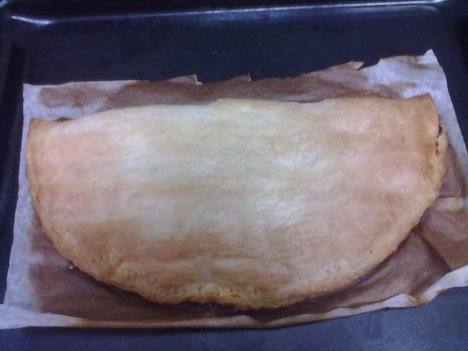 En la bandeja del horno extiendo la masa de hojaldre y cubro la mitad con la mezcla anterior, cubro la mezcla con la otra mitad del hojaldre, formando una empanada, junto los bordes para que no se salga la mezcla y la meto al horno ( 180º)durante 25 minutos (hasta que se dore el hojaldre).